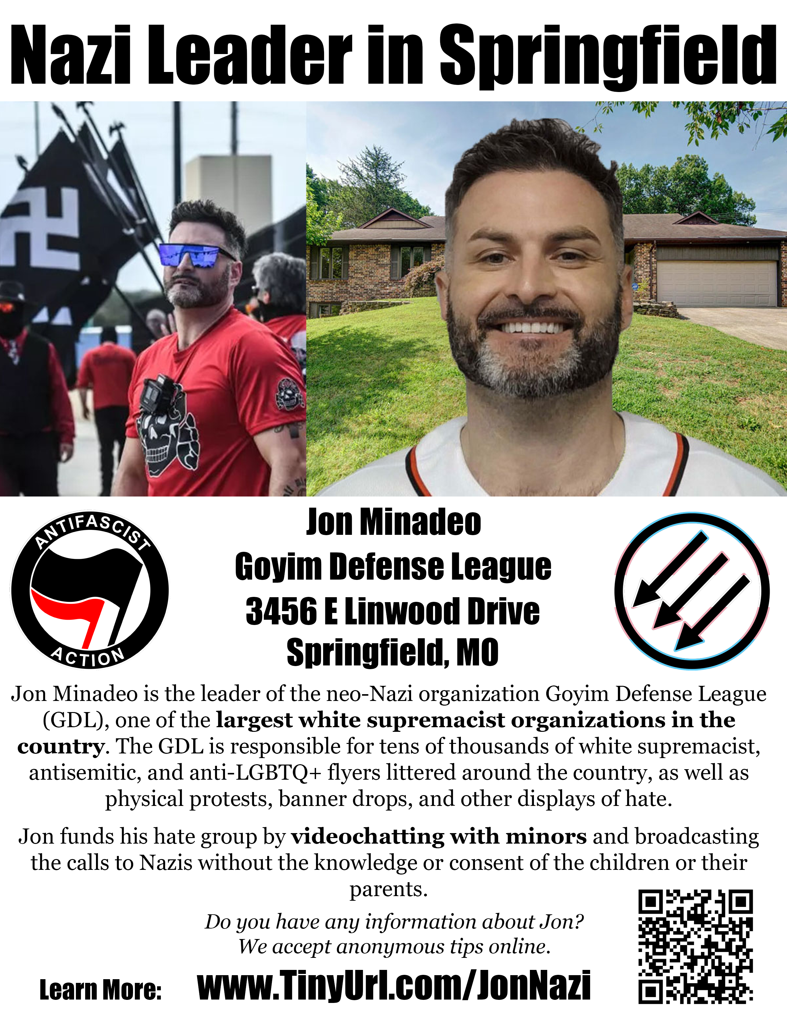 Springfield, MO is now the headquarters of one of the largest neo-Nazi hate groups in the country. Jon Minadeo broadcasts his show from his home, organizes racist marches, and prints thousands of antisemitic, anti-LGBTQ+, and white supremacist flyers. On top of that, Dominic DiGiorgio, the man who runs the GDL’s merchandise operation, is planning on moving his Nazi print shop to the area.